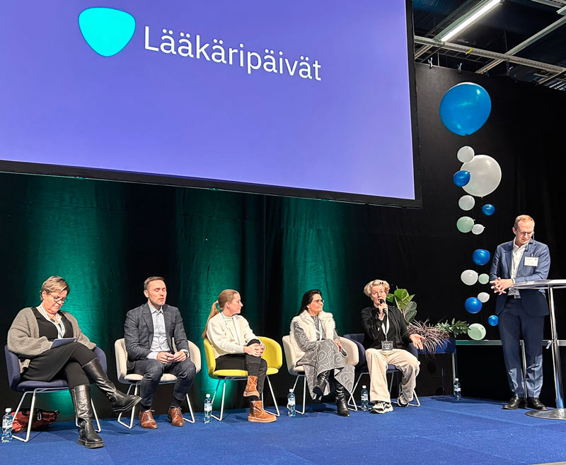 Suomen Erikoislääkäriyhdistyksen järjestämään paneeliin osallistuivat Sari Silventoinen (vas.), Markus Paananen, Marjo Niskanen, Sari Huikko-Tarvainen ja Minna Halinen. Puhetta johti SELYn puheenjohtaja Jussi Pohjonen.